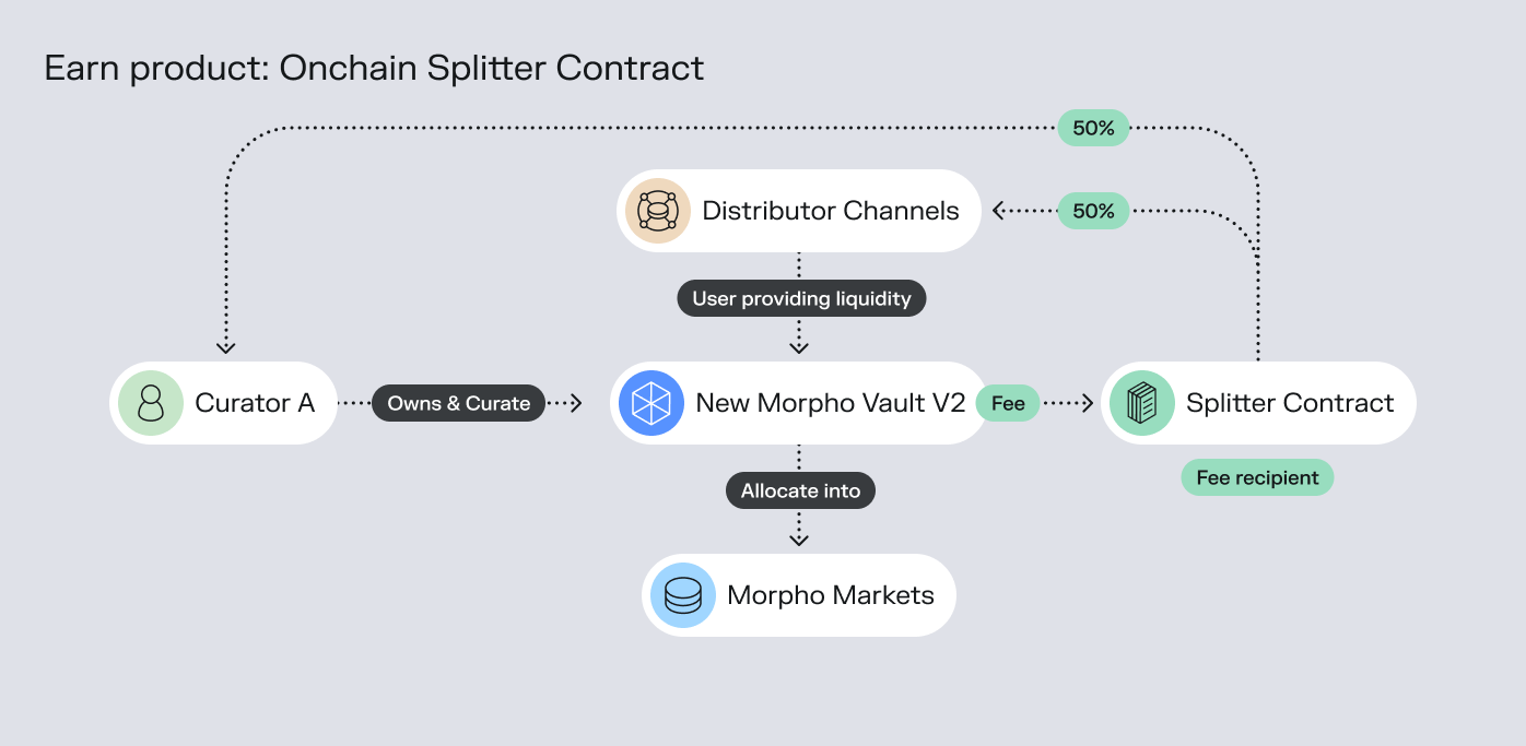 A distributor channel is any platform, application, or service that integrates Morpho's functionality to offer it to their own users. This includes wallets, DeFi aggregators, portfolio management apps, or custom interfaces that embed Morpho vaults. These distributors make Morpho accessible to users who might not otherwise directly interact with the Morpho protocol, and they can earn fees by facilitating these interactions.