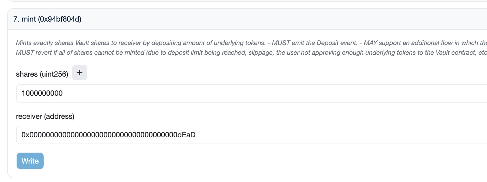 Setting up a dead deposit involves minting 1e9 shares from the target vault, on behalf of address 0x000000000000000000000000000000000000dEaD, through a simple process on a block explorer like Etherscan: