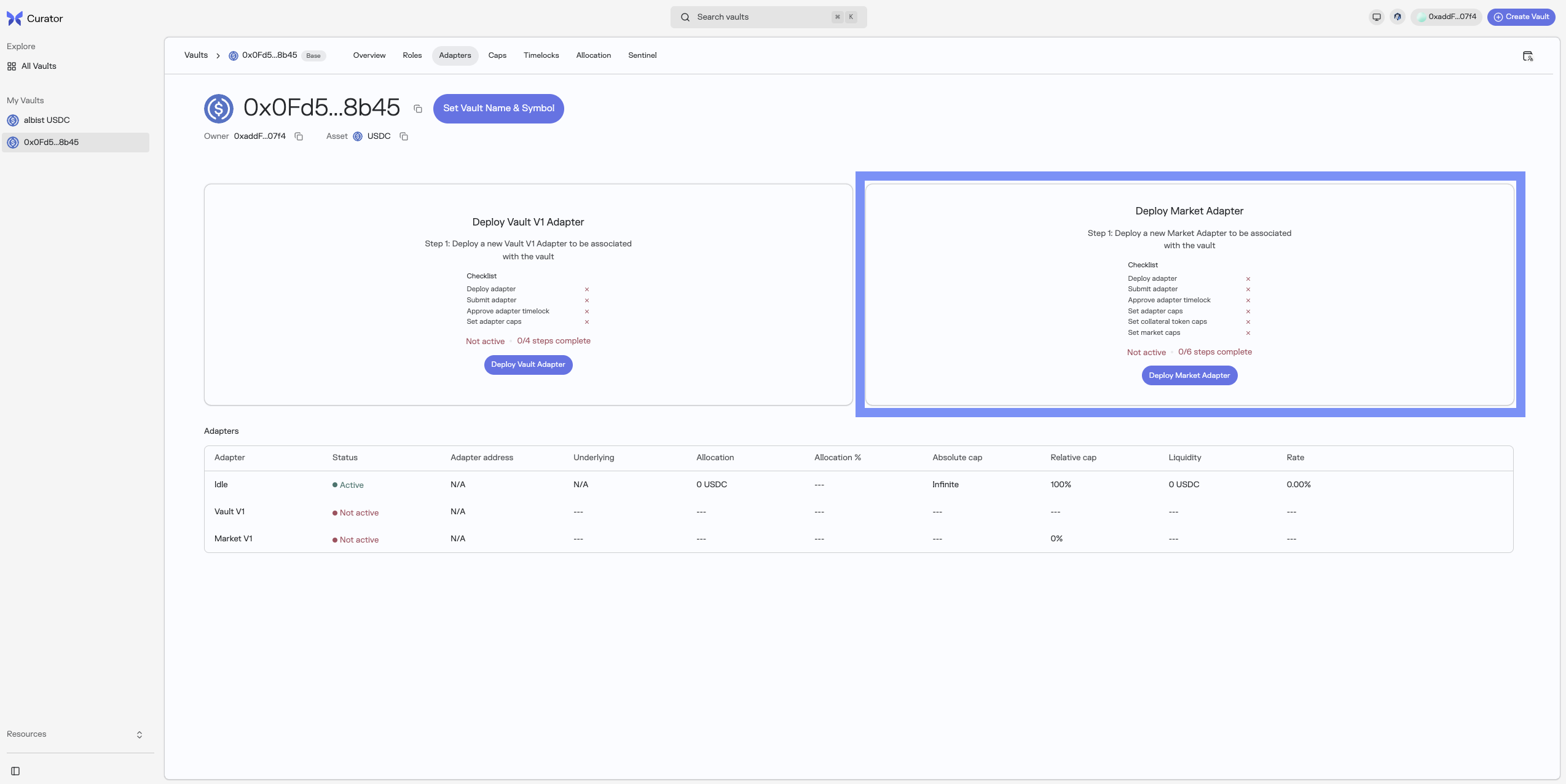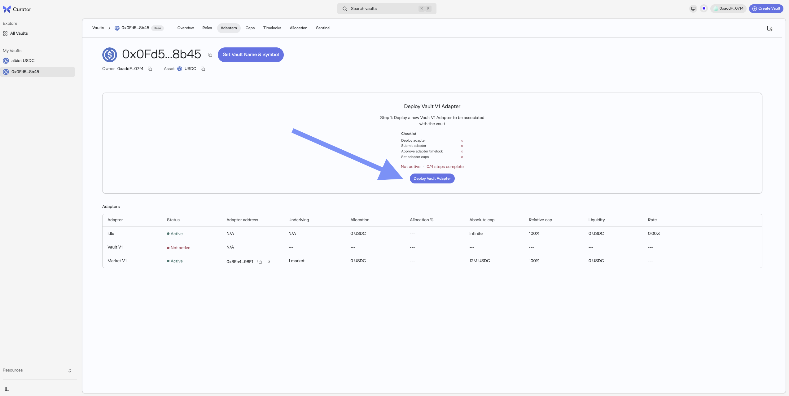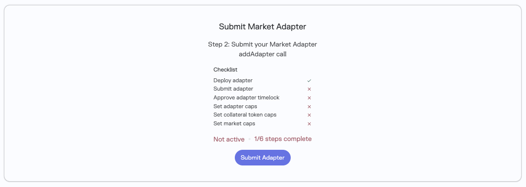 - Set the Adapter (two steps submit/approve timelocked operation) on the Adapters page
