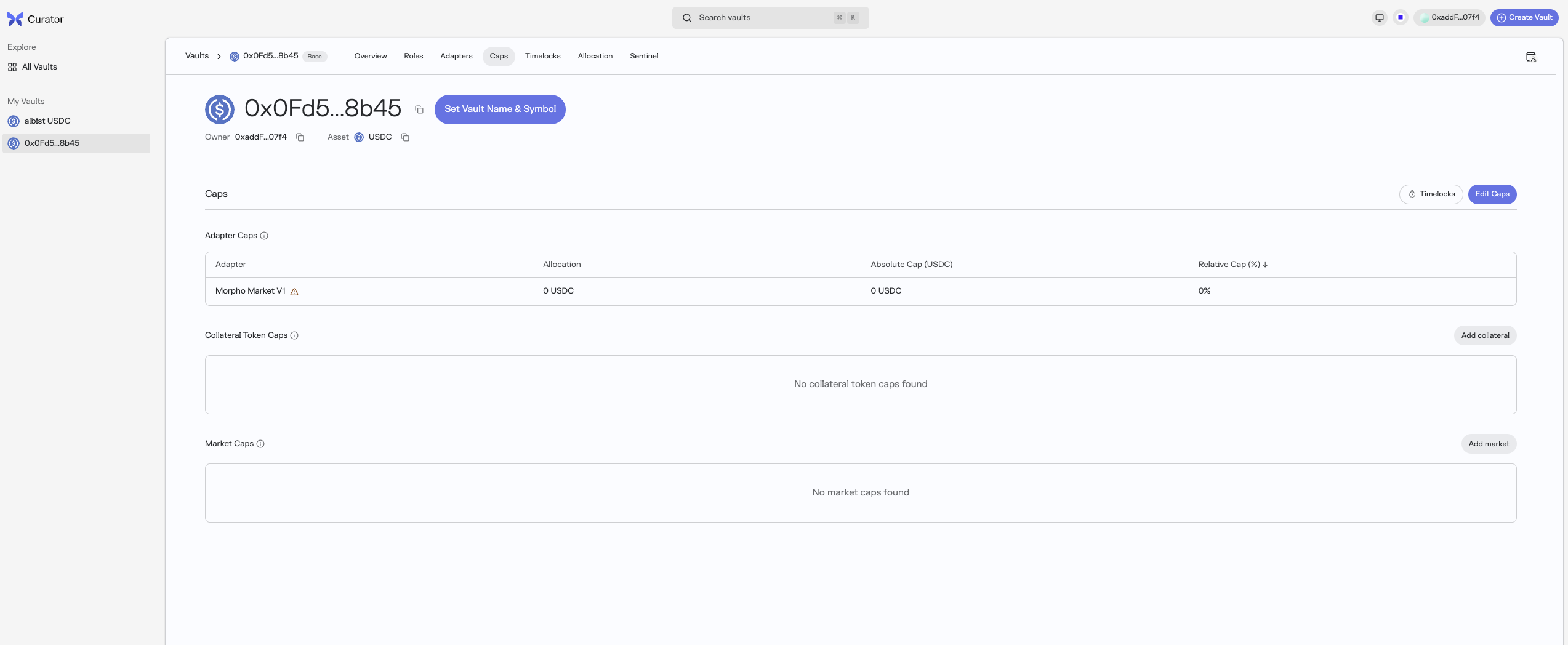 - Adapter Caps: via the "Edit Caps" button, set the Absolute (in loan asset) and Relative (in % of vault allocation) caps for the Adapter you just deployed and set to your Morpho Vault V2.