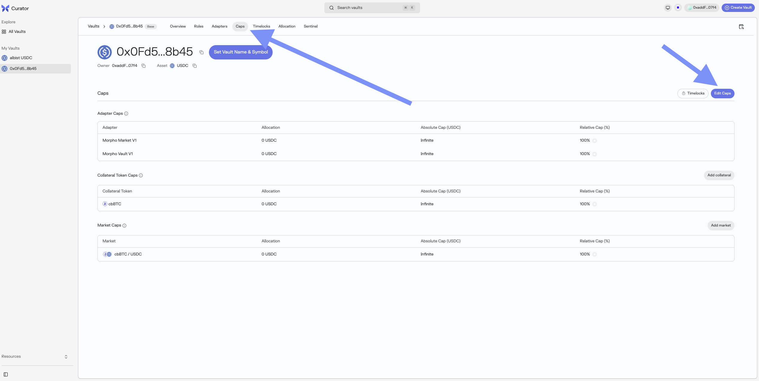 - Set the Adapter caps (two steps submit/approve timelocked operation) on the Caps page