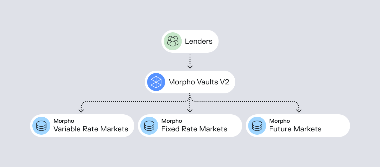 Morpho Vault V2 is Morpho's permissionless vault framework for curated lending strategies. It is designed around Adapters, a granular ID & Cap System, and automatic interest accrual through real-time asset reporting.